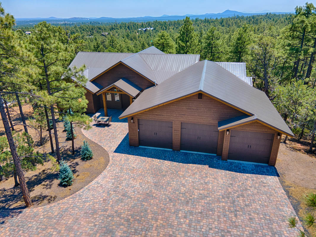 Aerial view of a forested property for sale in Show Low, Arizona with a modern driveway surrounded by lush greenery.