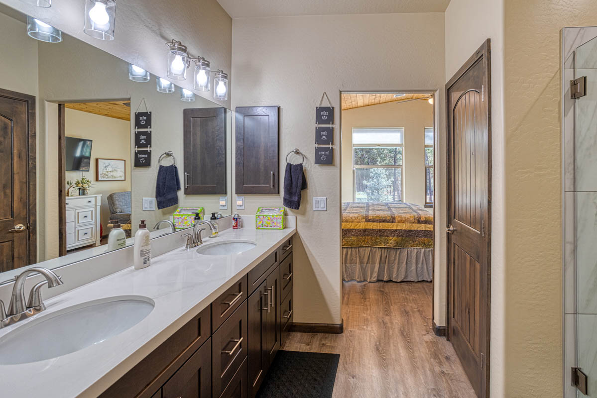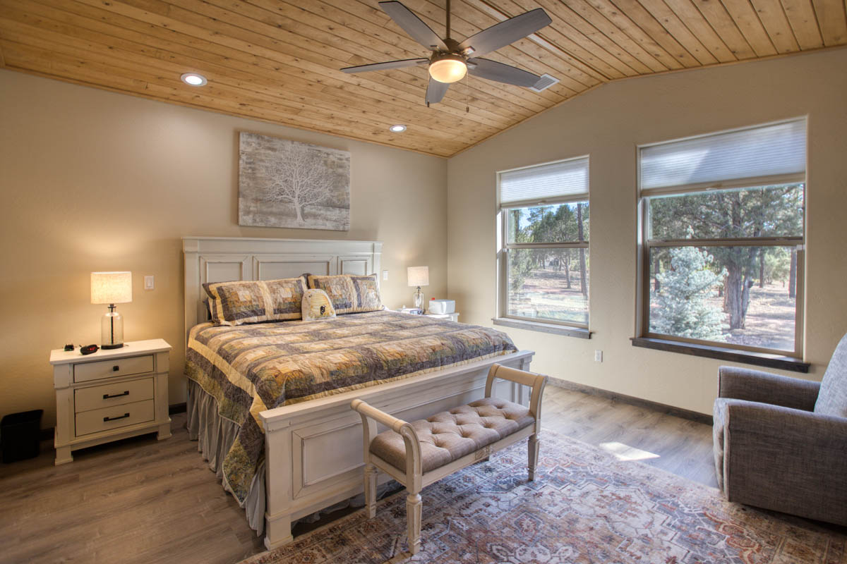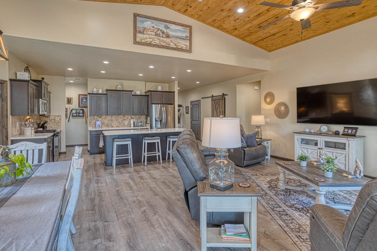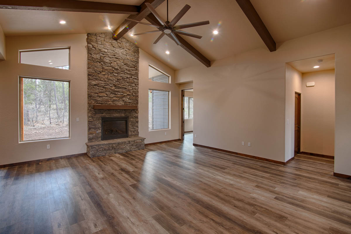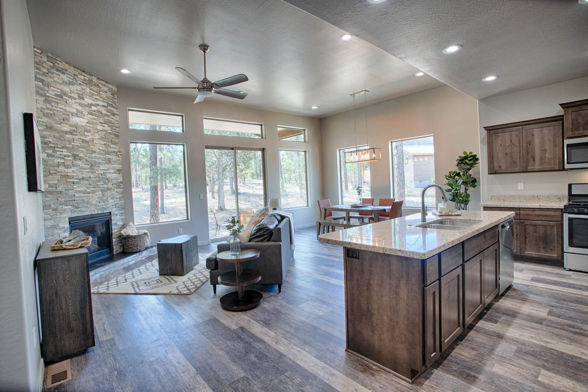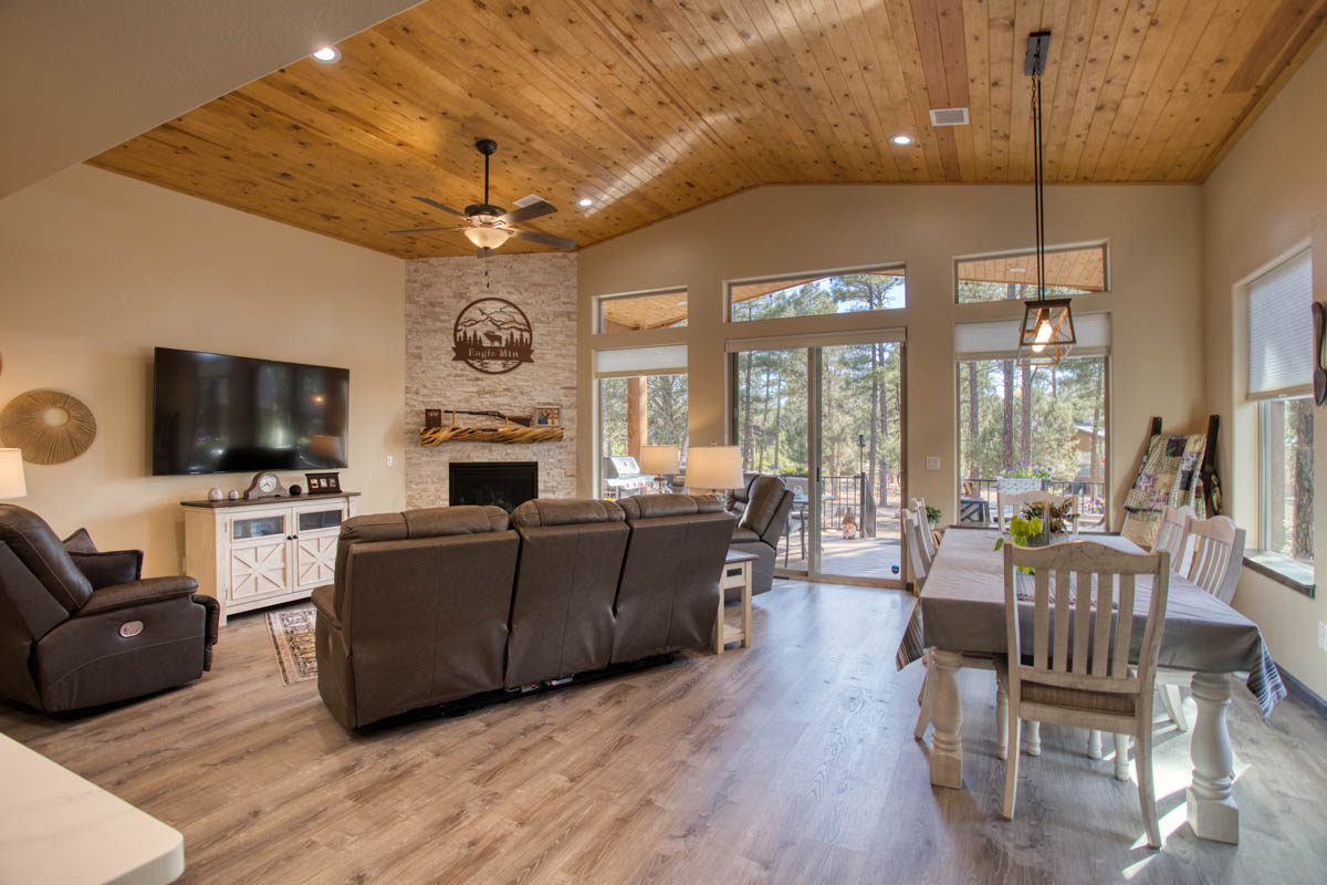 This charming 2-bedroom, 2-bath Ponderosa model nestled within the secure, gated community of Creekside at Eagle Mountain. Built in 2023 and situated on a low maintenance 0.17-acre lot, this home combines thoughtful design with modern comforts, ready to embrace you with warmth and style. Step inside to an inviting open-concept great room featuring vaulted ceilings, ceiling fans throughout, and a stone floor to ceiling gas fireplace, perfect for relaxing evenings or entertaining guests. The well-appointed kitchen boasts custom soft-close cabinets, stainless steel appliances, granite countertops, a walk-in pantry, and a separate desk or coffee bar area ideal for your morning routine or remote work. Durable vinyl flooring flows seamlessly throughout, offering both elegance and easy maintenance. The primary suite is a true retreat, with a vaulted ceiling and a stylish barn door leading to the master bathroom, which features updated light fixtures, a walk-in tile shower, double vanity, and a generous walk-in closet. The guest bathroom offers a large tub with a full tile surround. Outside the master bedroom windows, rolling shutters provide extra room darkening and added noise reduction, creating a peaceful and cozy sleeping environment. Additional highlights include a separate laundry room with a barn door, abundant storage space throughout, and a spacious 2-car garage. Enjoy outdoor living on the large covered back deck with low-maintenance Trex decking, which overlooks a greenbelt area filled with tall pines and offers direct access to a maintained walking trail. The front porch also features low-maintenance Trex decking. Comfort and convenience are enhanced by a WiFi-enabled irrigation system and thermostat, a water softener, low-maintenance metal roofing and siding, and a paver driveway with added gravel in the front and side yards for easy landscaping care. Nearly all furniture, including the washer and dryer, conveys with the sale, with a list of excluded items provided. Located close to all the amenities Show Low has to offer including lakes, hiking trails, golfing, and dining, this home beautifully blends quality, comfort, and security for year-round living or seasonal enjoyment. Experience the four seasons and local wildlife in this beautiful area.