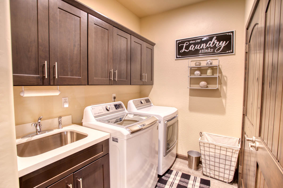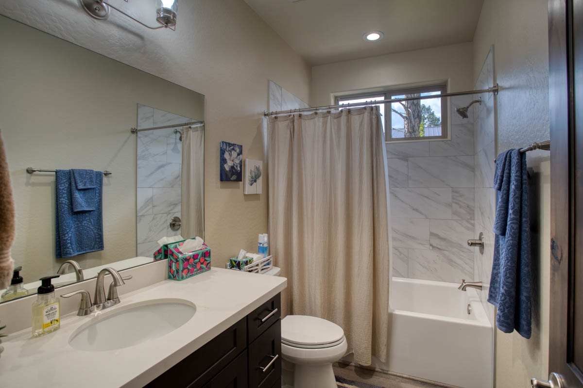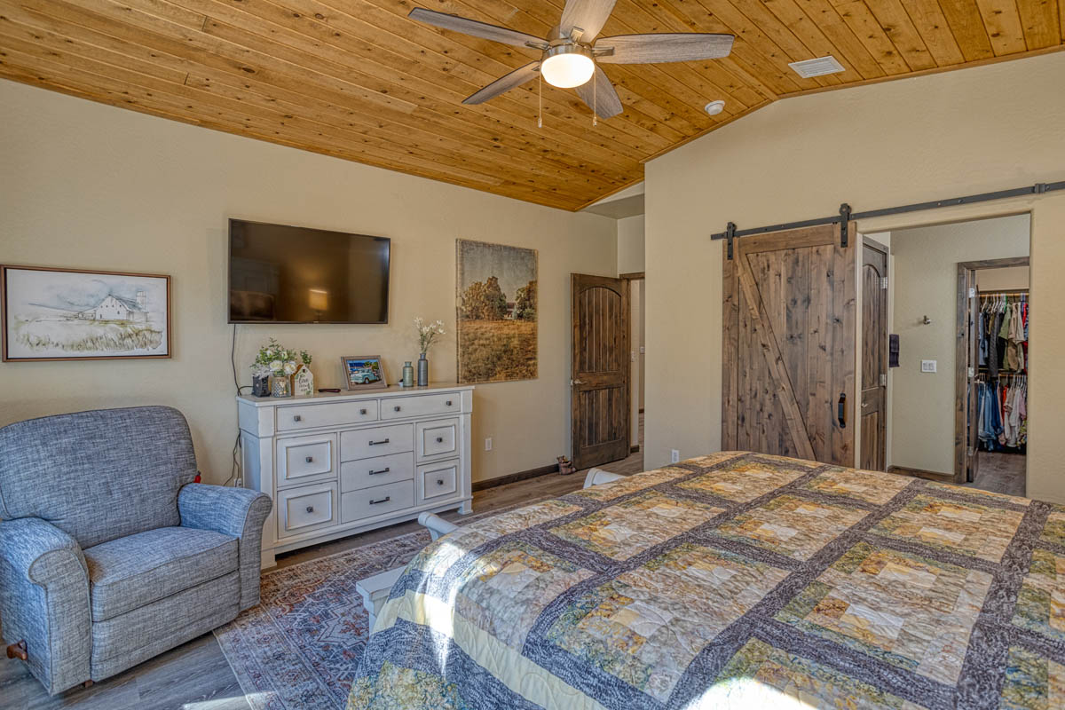 Barn doors add a touch of rustic charm, leading to both the master bath and the laundry room. The guest bathroom includes a large soaking tub with tile surround and a glass door.
