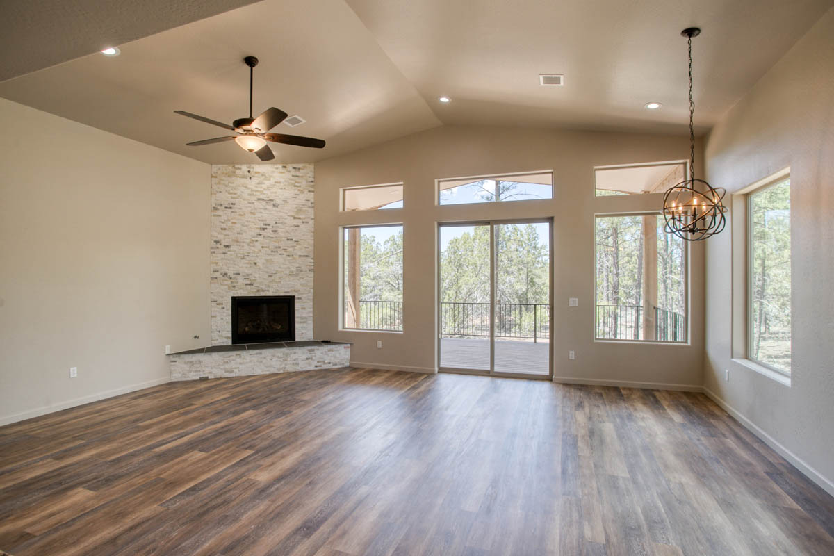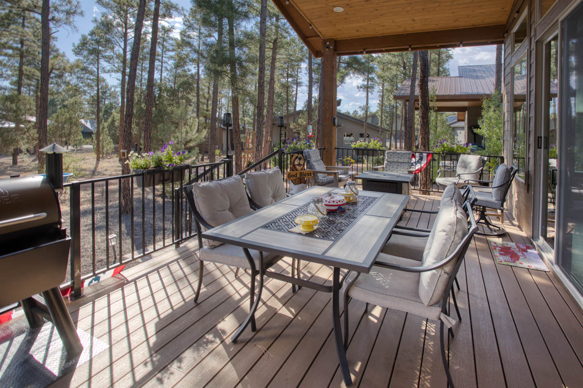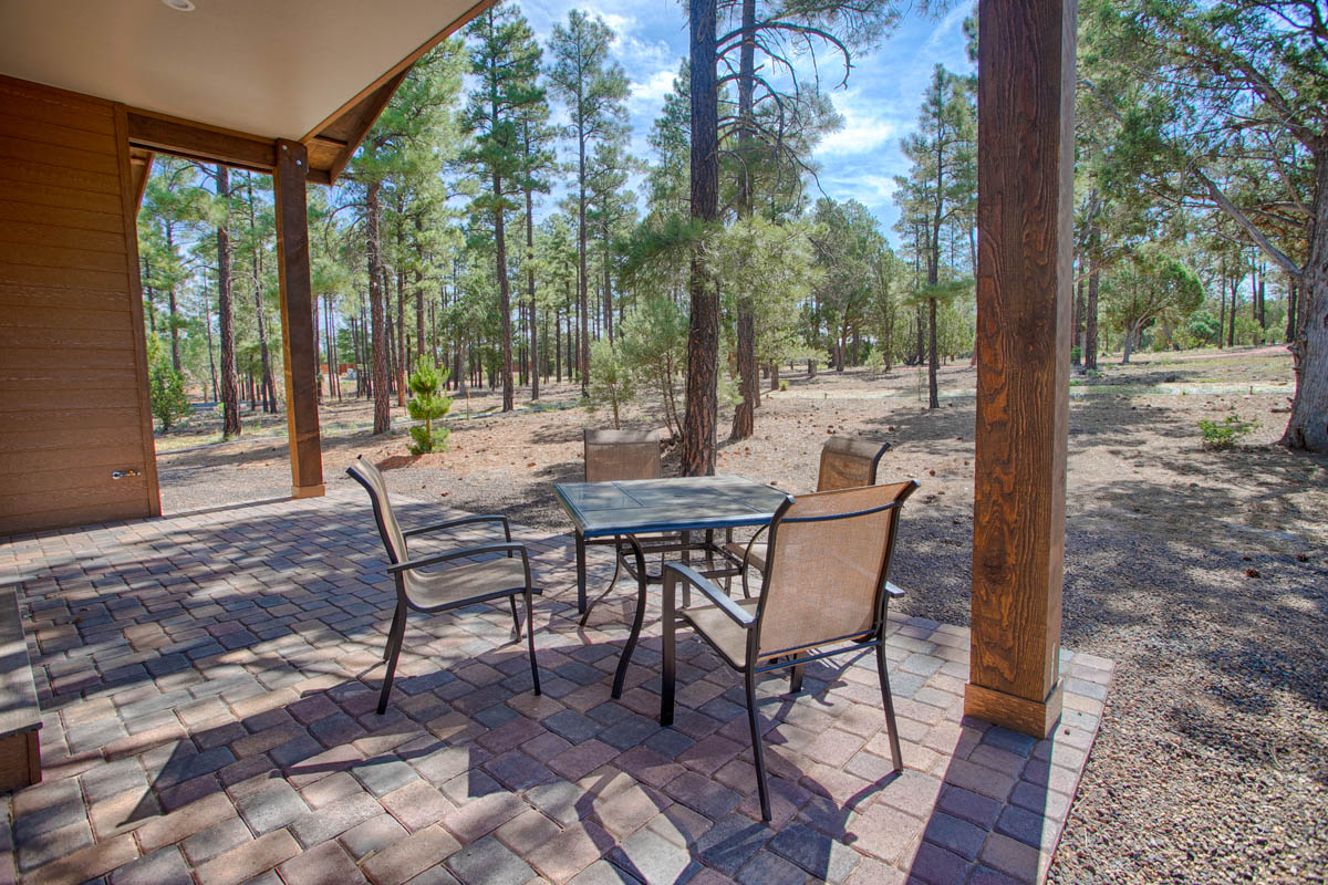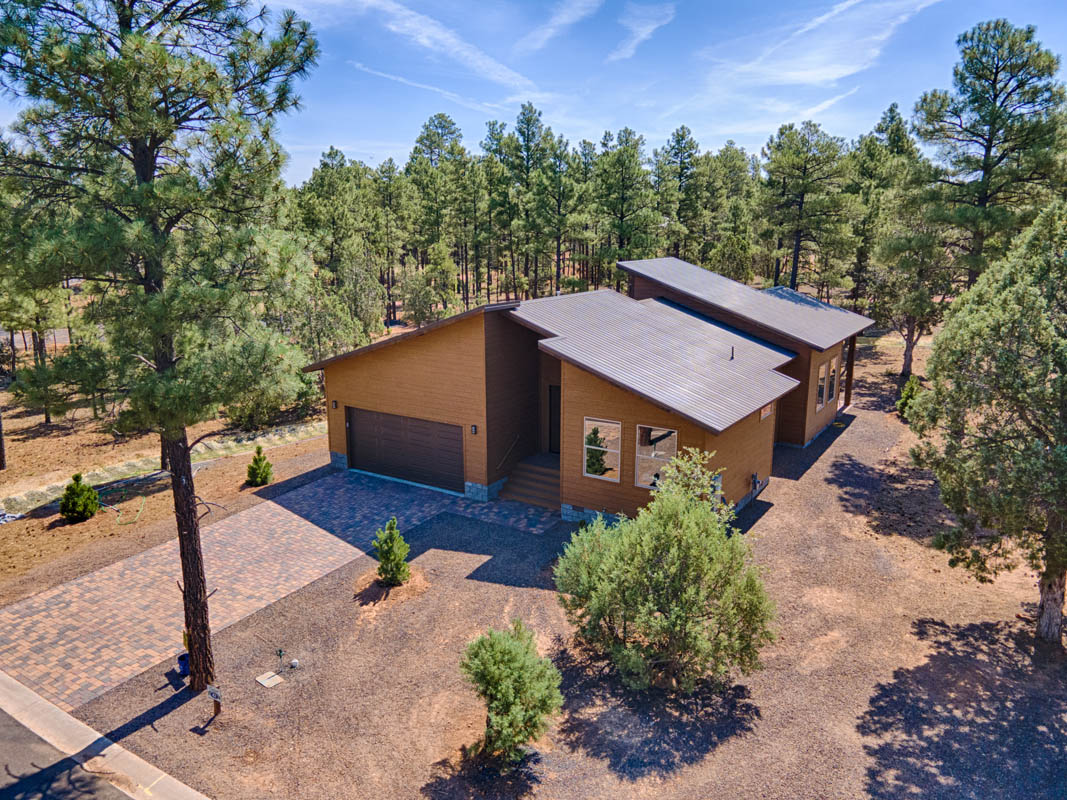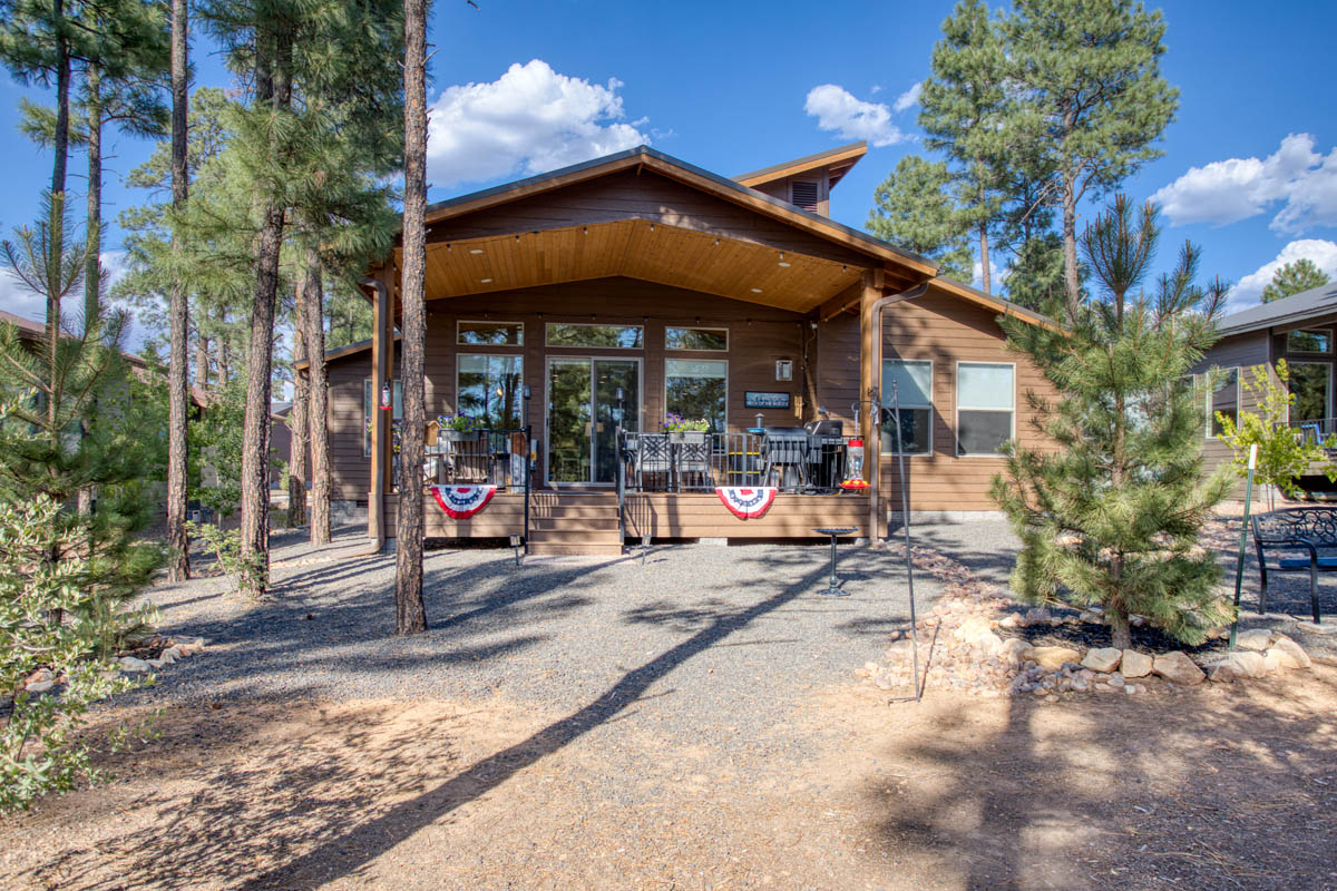 Exterior view of modern homes in a tree-filled neighborhood for sale in Show Low, Arizona. Peaceful and secluded setting.